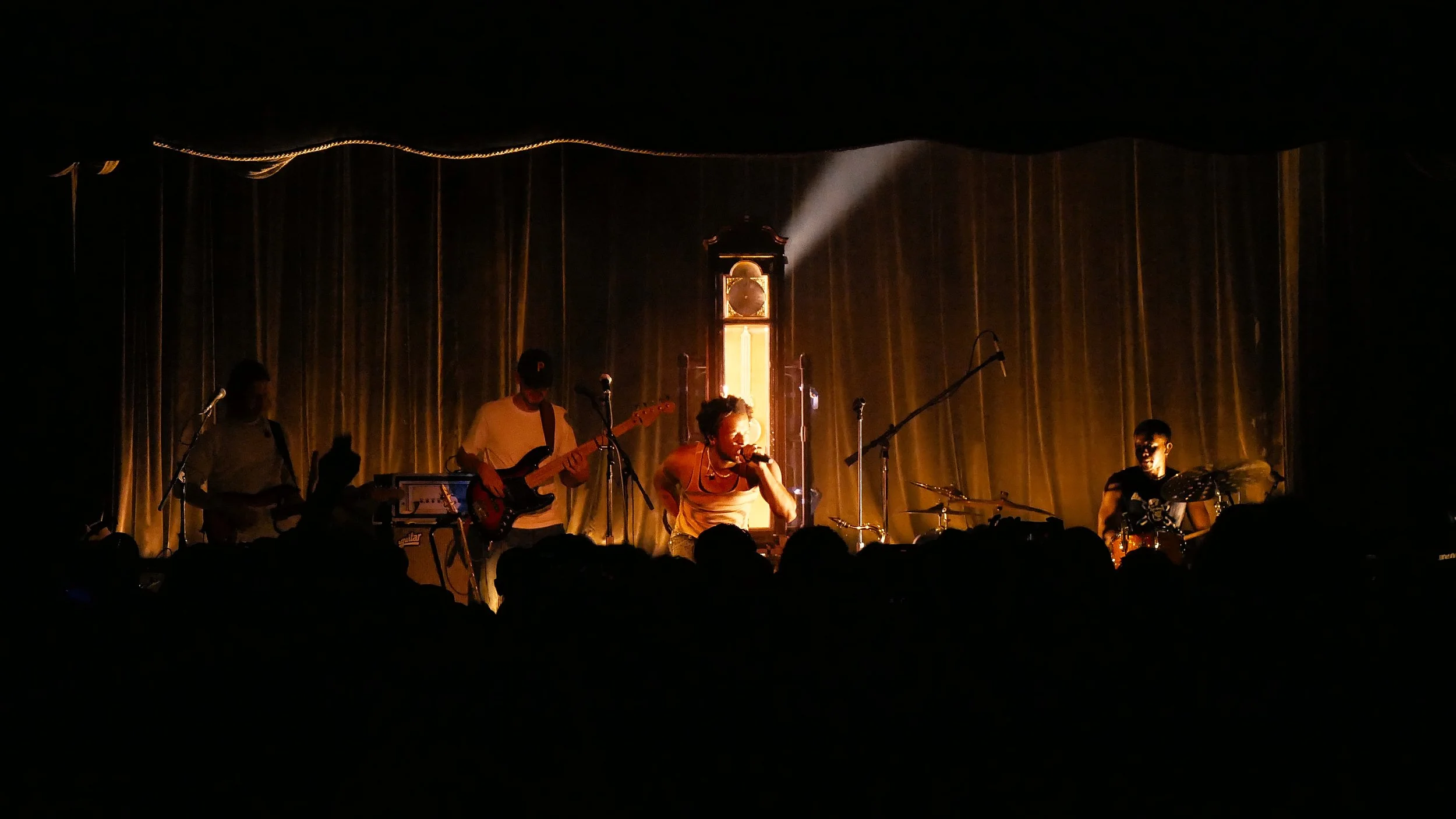 On Tuesday night, Cautious Clay brought The Hours tour to Bimbo’s 365 Club in San Francisco. Perched blocks away Fisherman’s Wharf, the venue is swanky and lofty, its GA section bordered with intimate cocktail tables. Shimmering gold and red velvet curtains hang off the walls, like the audience was being set up for a jazz show.